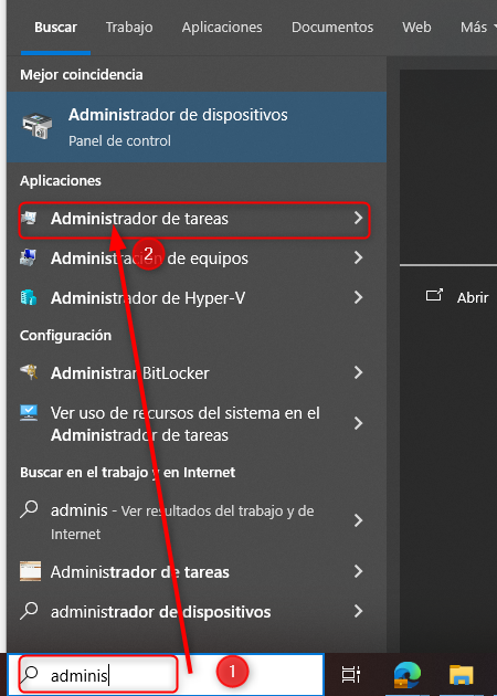 1>> Buscar en la barra del escritorio y escribimos «Administrador de Tareas»