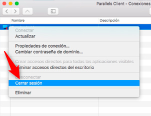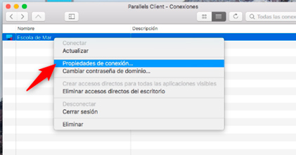 Abrimos el Parallels y nos vamos a las propiedades de la conexión, haciendo botón derecho en la conexión existente.