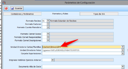 Abrimos el programa (Socios, Pistas, etc..), para saber la ruta donde debe apuntar la exportación de los archivos debemos ir a una opción que nos permita buscar la ruta, por ejemplo, los Parámetros de configuración. Buscamos la carpeta del escritorio y veremos la ruta que tenemos que poner.