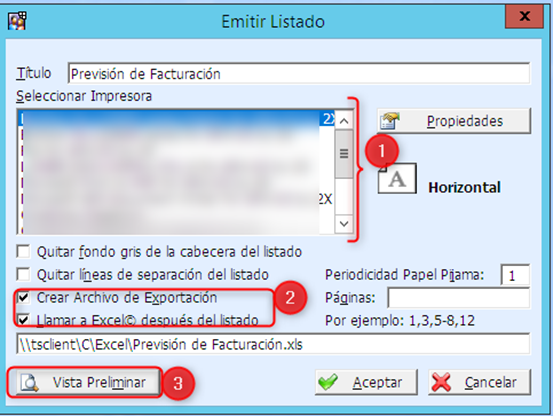 Presionar «Vista preliminar», mostrará listado, si se ha seleccionado una impresora, se podrá imprimir o crear un PDF.