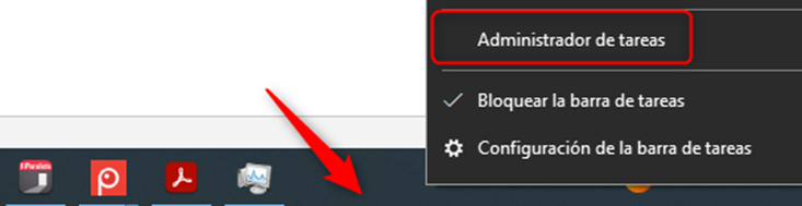 Para comprobarlo debemos hacer botón derecho en la barra de tarea del PC, mostrará desplegable y seleccionar “Administrador de tareas”.