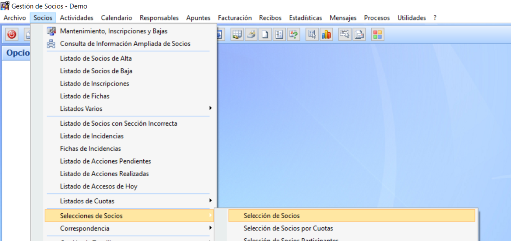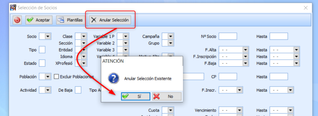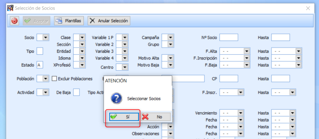 Posteriormente desde esta misma pantalla deberéis realizar la selección, en el ejemplo seleccionaremos todos los socios de alta, indicando en estalo «A», al aceptar deberéis contestar afirmativamente a la pregunta :