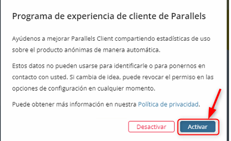 Esa nueva contraseña la deberemos configurar en el acceso a Parallels, recomendamos que la guarde con seguridad.
