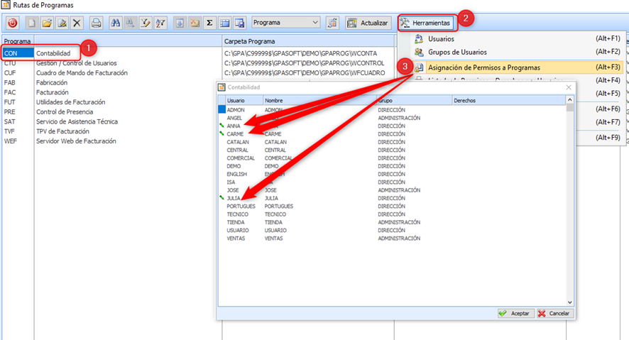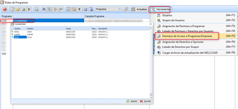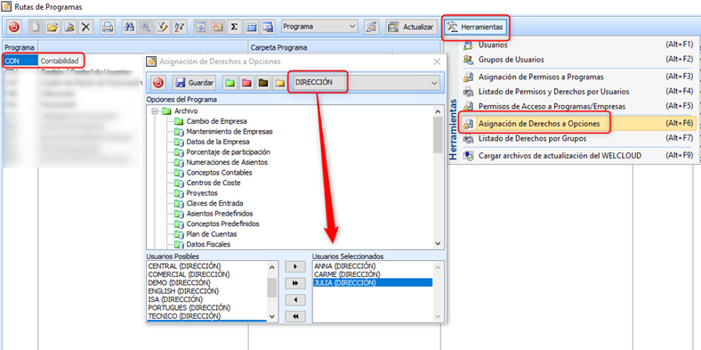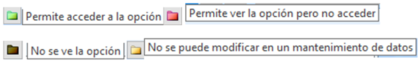 La asignación de derechos o la restricción de acceso a las distintas opciones del programa para un grupo se realiza mediante el uso de carpetas de colores.
