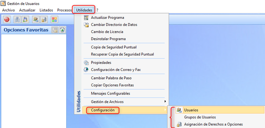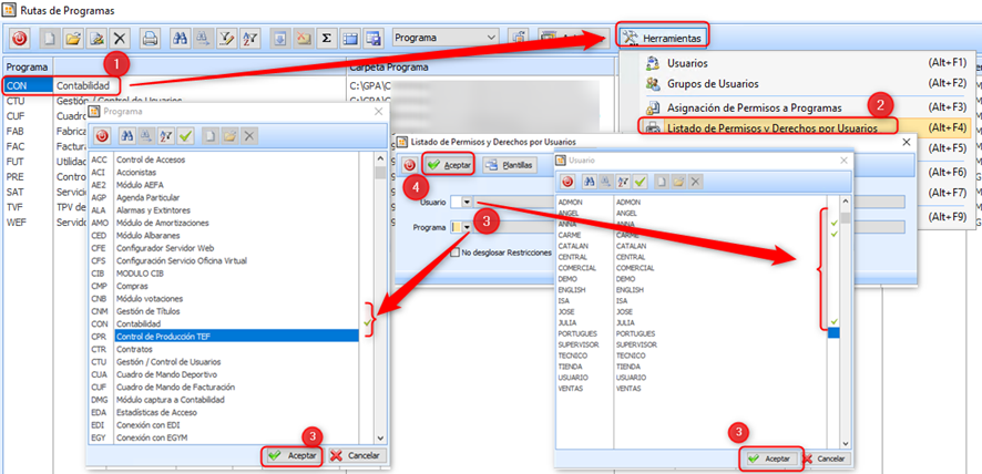 El programa de Control de Usuarios administra la gestión de usuarios, permisos y accesos en todos los programas del sistema.