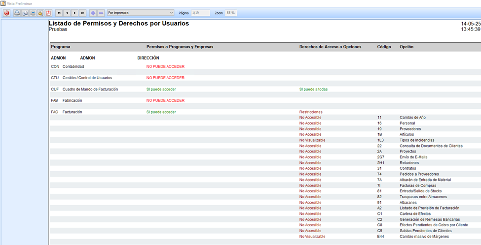 El listado nos permite ver los diferentes usuarios que acceden al programa y a que tienen opciones