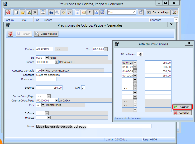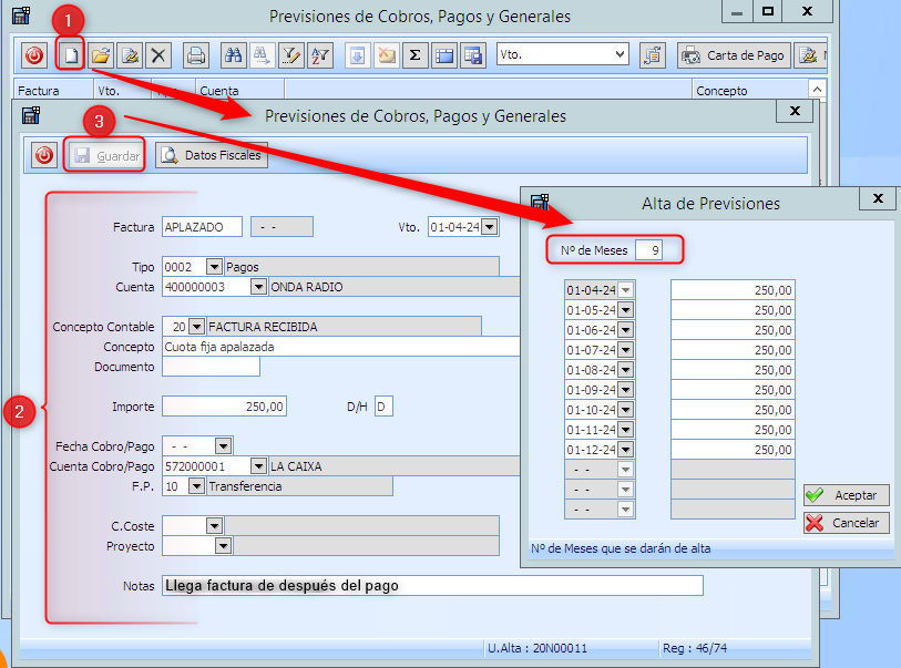 Hoja en blanco dar alta de la previsión que se debe repetir, al guardar el programa mostrará previsión de los meses restante del año en curso.
