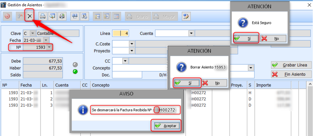 1.- Hay que mirar el número de asiento de la factura «Facturas Recibidas», ir al asiento y eliminar el asiento.