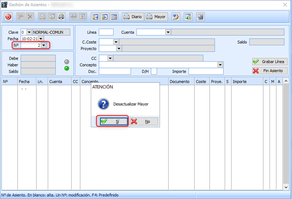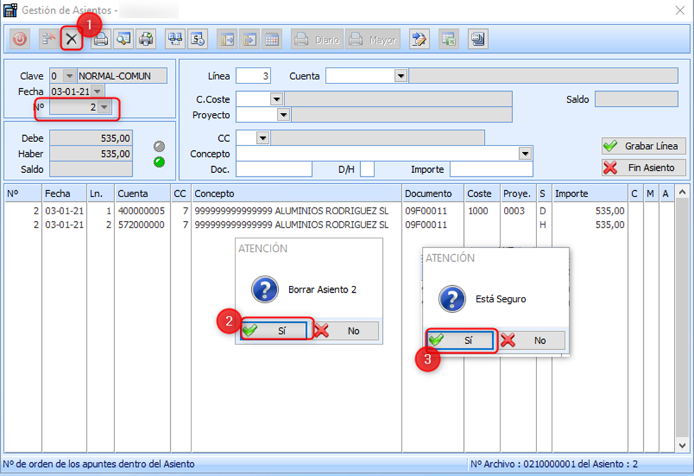 Desde Gestión de asientos, llamar al asiento y eliminar