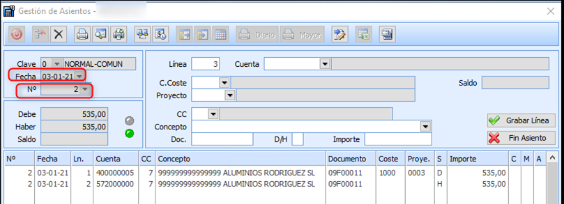 Si se ha tiene que recuperar, comprobar en el mayor, fecha de asiento y número.
