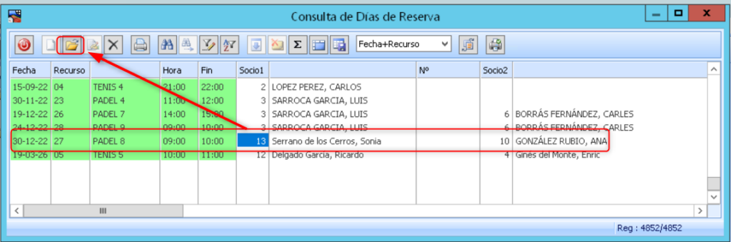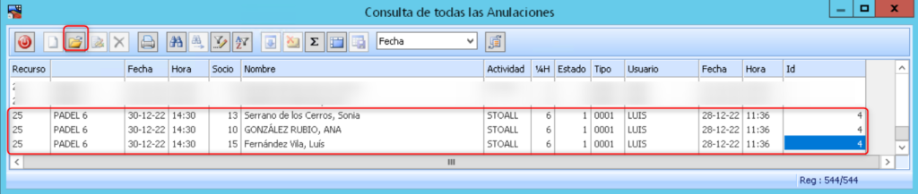 IMPORTANTE ; en el caso de no localizar la reserva en el Registro de reservas, es que ha sido anulada y por lo tanto para poder verla, deberéis acceder a la de Consulta de todas las cancelaciones en la opción: Control de instalaciones > Cierre > Consulta de Todas las Cancelaciones