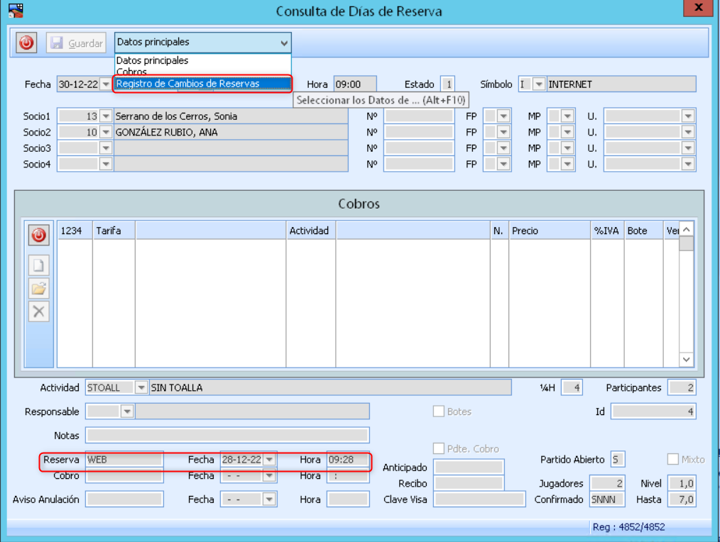Donde entrando en una Reserva utilizando el botón que muestra la imagen o bien F3 se accede a los datos de la reserva, donde se verá desde donde se ha realizado la reserva, el dia y la hora., en el ejemplo, se ha realizado a través de la web, el dia 28.12.22 a las 09:28