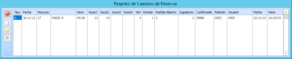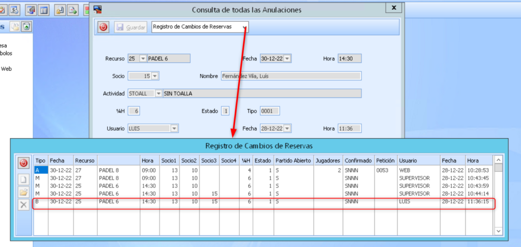 En el Cuarto registro veréis que el tipo es M, lo que significa modificación, y donde se ve que el usuario Supervisor el dia 28.12.22 a las 10:44:14 añadió un jugador a la reserva, el socio nº 15