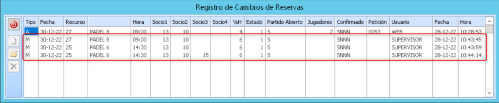 En el Tercer registro veréis que el tipo es M, lo que significa modificación, y donde se ve que el mismo usuario Supervisor el dia 28.12.22 a las 10:43:59, modifico la pista, originalmente era Padel 8 y la cambió a Padel 6, y tambien la hora del juego, originalmente a las 09.00 y modificada a las 14.30