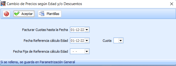 * Opcionalmente Se puede indicar (opcionalmente) la Fecha Fija de Referencia para el cálculo de las Edades, que se utilizará para otros procesos que también ajustan los Precios o Cuotas según Edad, por lo general ese dato se deja en blanco