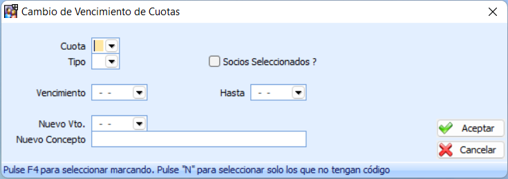 En el caso de que la modificación del vencimiento sea a unos socios en concreto deberéis realizar una selección previa, (véase apartado de Selección de Socios), y marcar el dato «Socios Seleccionados?»