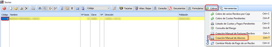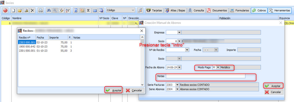 Por defecto muestra nº socio, presionar tecla «Intro», mostrará recibo/s pendiente, seleccionar el que se debe abonar y aceptar.