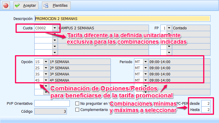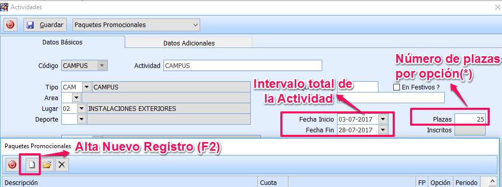 En el caso de que la inscripción tenga la posibilidad de seleccionar más de una combinación de Opciones/Periodos y esto suponga unas Tarifas diferentes a las definidas en la selección unitaria, deberán utilizar la opción de Paquetes Promocionales. Desde la Actividad utilizando el desplegable o bien Ctrl+ F5, accederán a la tabla de Paquetes Promocionales