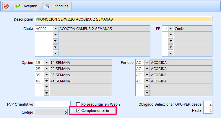 En el caso de que exista alguna de estas combinaciones que pueda ser adicional pero no obligatoria deberán marcar la pestaña de “Complementario”, en el ejemplo que muestra la imagen, utilizamos el servicio de Acogida