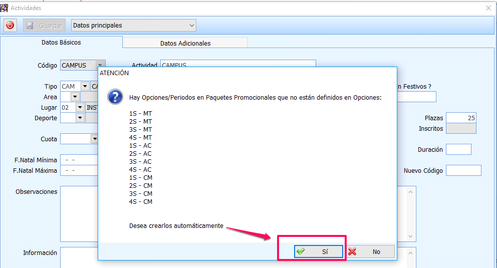 Una vez configurados todos los Paquetes Promocionales necesarios al guardar la Actividad, el programa nos mostrará el siguiente mensaje: