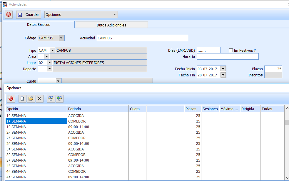 Importante: que en la creación de la actividad, pongan el número de plazas por opción, en el caso de que puedan variar, deberán indicar el número de plazas más coincidente y posteriormente entrar en cada una de las opciones con número de plazas distinto al genérico de la Actividad para poder modificarlo