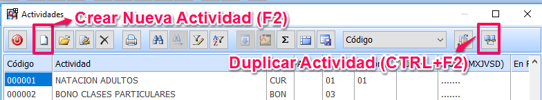 Deben crear las nuevas Actividades utilizando la hoja en blanco o la tecla F2, o bien duplicando otra Actividad ya existente con el botón que indica la imagen o CTRL+F2 , desde la opción: Gestión de Socios > Actividades > Actividades