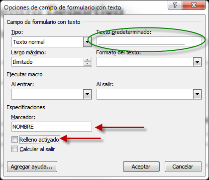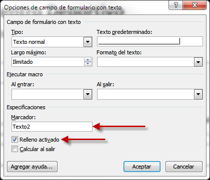 En Marcador dejaremos el que nos indique Word por defecto y en Relleno activo lo dejaremos marcado. Una vez se cree el documento, solo se permitirá modificar estos datos.