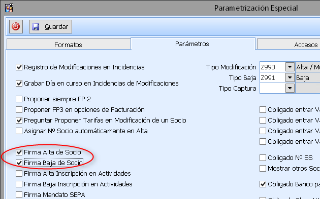 En Procesos > Parametrización Especial, debemos marcar las opciones Firma Alta de Socio y Firma Baja de Socio. De esta forma nos obliga a que el socio firme.