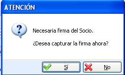 En el caso de no haber capturado la firma nos presenta el siguiente aviso, donde nos pregunta si queremos registrar la firma en ese momento, en el caso de no registrarla no nos deja continuar con el proceso.