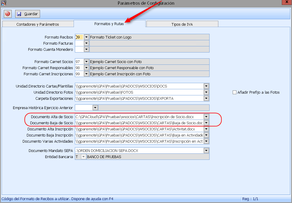 Entramos en la pestaña Formatos y Rutas, modificamos las rutas dónde tenemos guardado el Documento de Alta de Socios y el Documento de Baja de Socios.