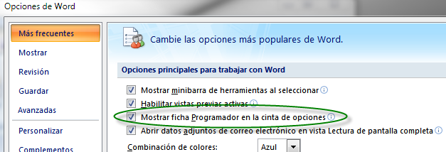 La primera vez que queramos crear nuestro formulario en un documento será necesario activar el menú Programador de Microsoft Word.