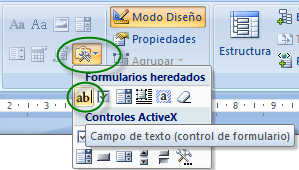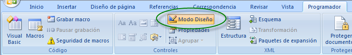 Para insertar un campo de formulario colocaremos el cursor en el lugar seleccionado y pulsaremos en el menú Programador donde activaremos la opción Modo Diseño.
