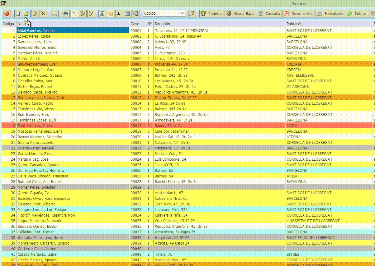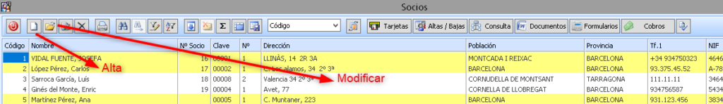 Para modificar un Socio, se pulsa el botón de la carpeta (o la tecla F3).