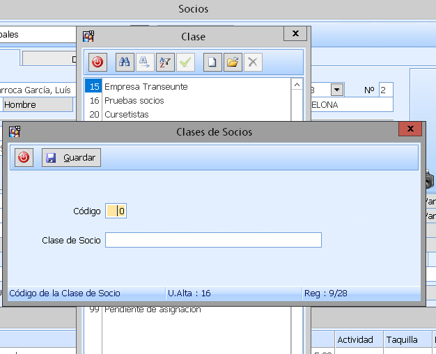 Hay tablas como Poblaciones, o Clases, que permiten dar de alta nuevos registros en el mismo momento que se está dando de alta un Abonado. Por ejemplo en clases.