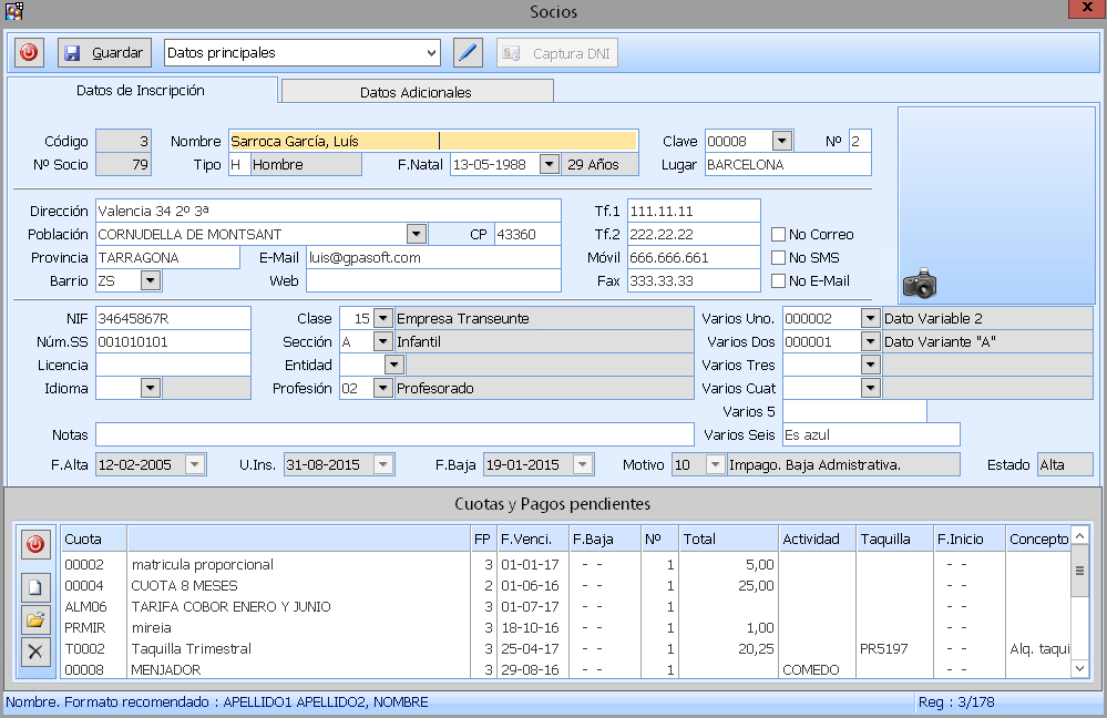 - Los datos “Variable 1,2, 3, 4” son utilizados para clasificar o añadir algún comentario a los Abonados, según las características que desee resaltar el club o gimnasio. Son datos que se usarán para selección en los listados.