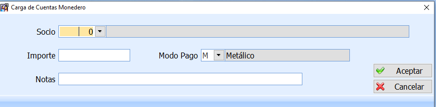 A través de esta opción del programa podrá realizar una carga de saldo en la cuenta monedero del socio