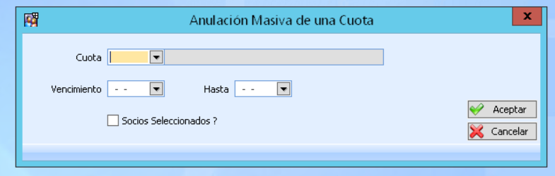 Deberéis indicar la cuota a anular, el intervalo de vencimientos que tiene que tener la cuota, y marcar el check de «Socios Seleccionados», en caso de haber realizado una selección previa (véase la guía de Selección de socios véase guía de selección de socios )