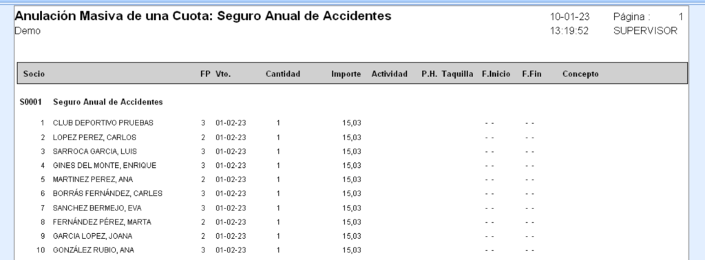 Una vez rellenados los datos necesarios , al aceptar el programa mostrará un listado con los abonados y las cuotas a anular