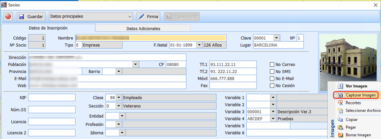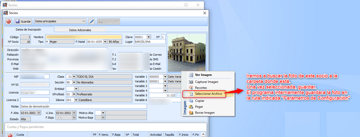 Desde la ficha del socio, posicionarse en el campo foto, botón derecho del ratón para capturar la foto.