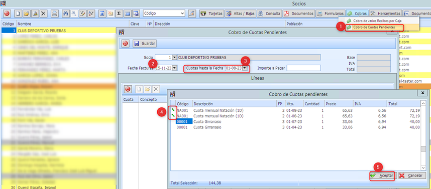 3.fecha de las cuotas 4.Seleccionar las cuotas a cobrar