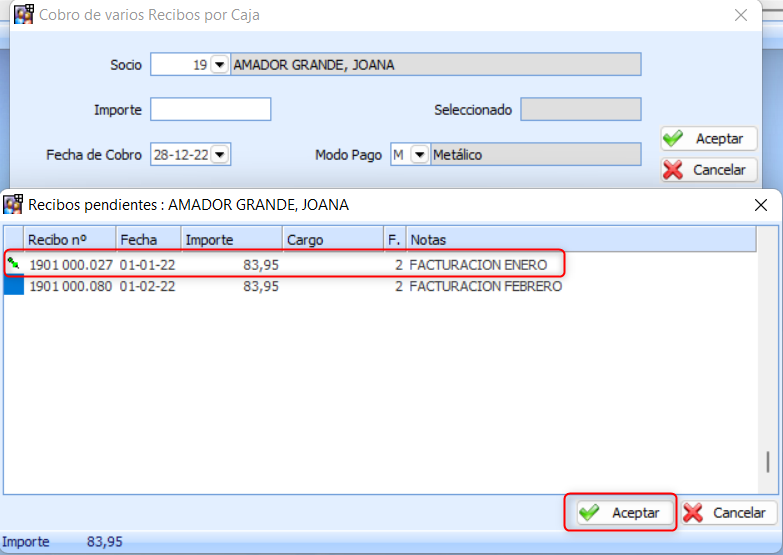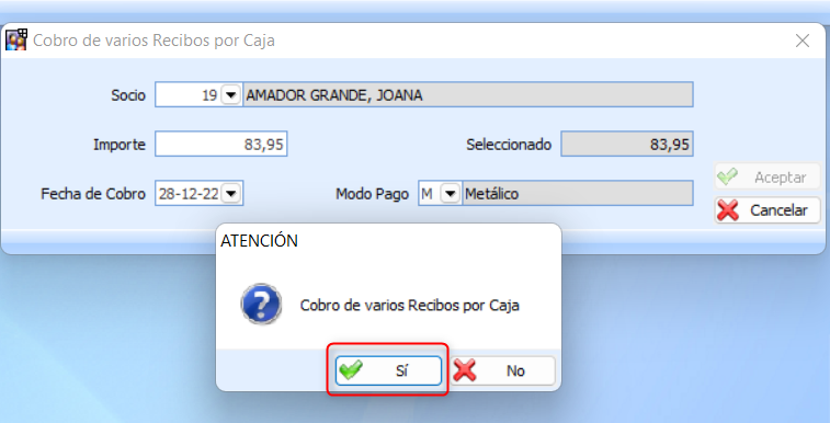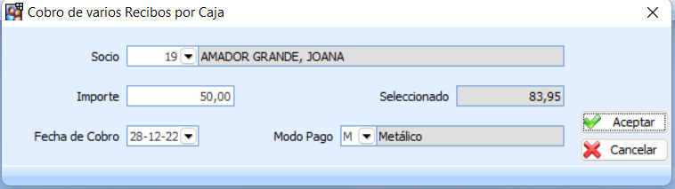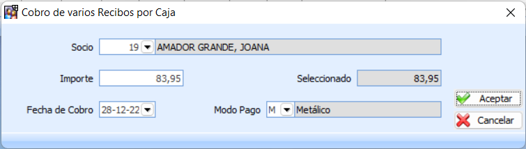 Una vez se acepte, el programa rellena el importe del recibo seleccionado, se podrá modificar el importe (en caso de que el cliente realice el pago de solo parte del recibo), la fecha de cobro, y el modo de pago