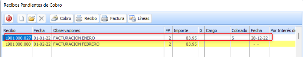 Dejando el importe en blanco y dando «Intro» aparecerá una nueva pantalla donde podréis seleccionar uno o varios recibos, para darlos por cobrados