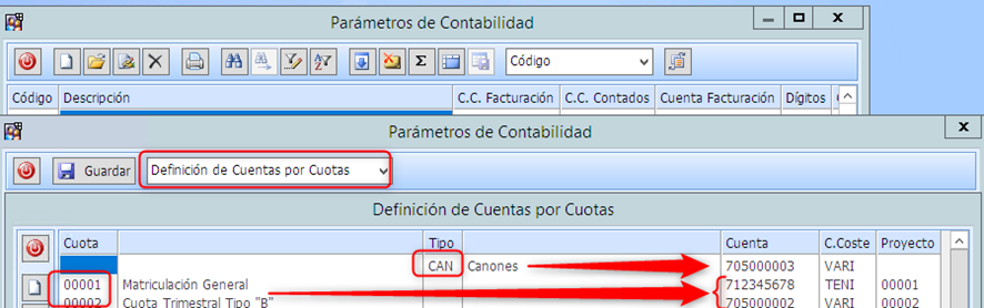 Las Tarifas que no estén indicadas en esta tabla, por defecto irán a la cuenta contable que se indica «Contrapartida Cuotas» de la página «1»
