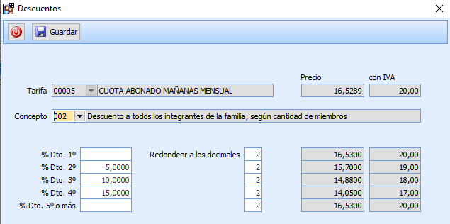 Gestión de Socios > Archivo > Tabla de Tarifas > Configuración de Descuentos Variables