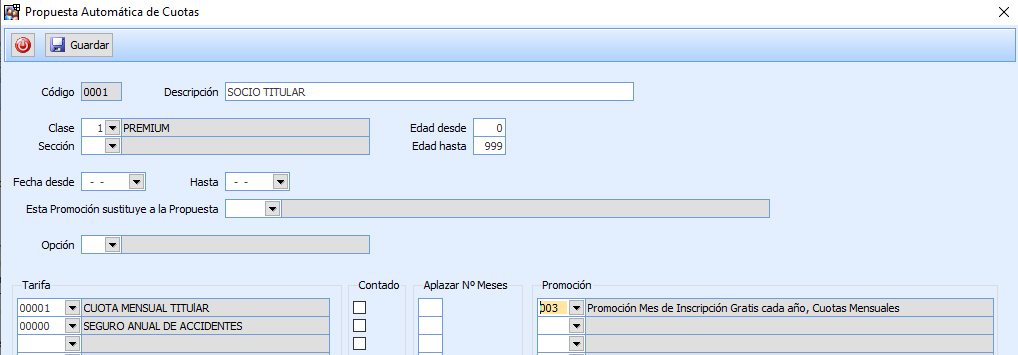Las Cuotas Mensuales que tengan asignada esta promoción, el Precio es cero en el Mes de Inscripción. (se utiliza exclusivamente para la propuesta automática de cuotas)