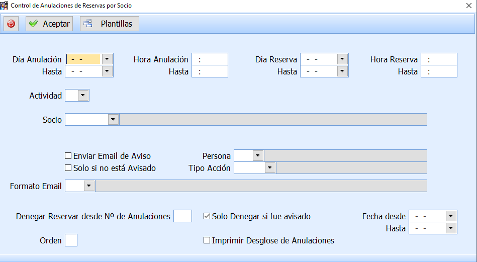 Deberían marcar con un número el dato «Denegar Reservar desde Nº de Faltas». Por ejemplo, si indicar «2» se denegará a todos los Socios que hayan tenido 2 o más faltas en el periodo seleccionado.