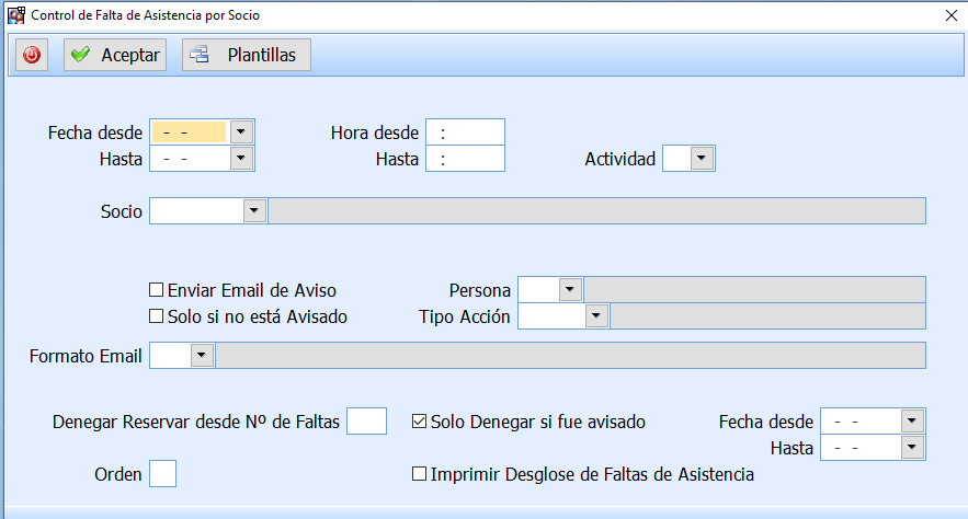 Este proceso permite denegar que sigan reservando AADD los socios del listado. Deberian marcare con un número el dato «Denegar Reservar desde Nº de Faltas». Por ejemplo, si indicar «2» se denegará a todos los Socios que hayan tenido 2 o más faltas en el periodo seleccionado.