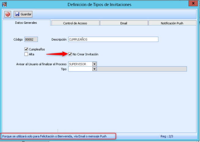 Se debe crear un registro nuevo y marcar el check de “Cumpleaños” y MUY IMPORTANTE el de “no crear invitación”, para que solo envíe el mail o push de felicitación al socio.