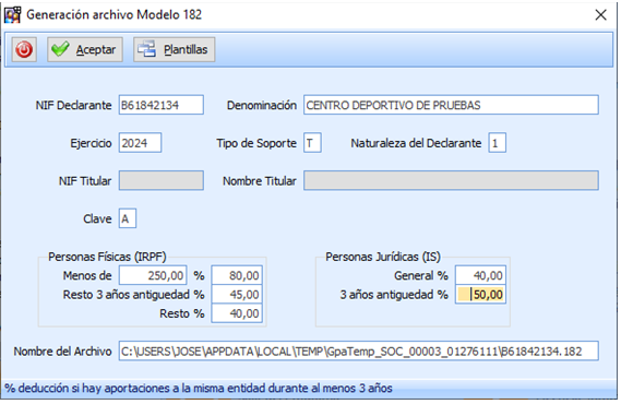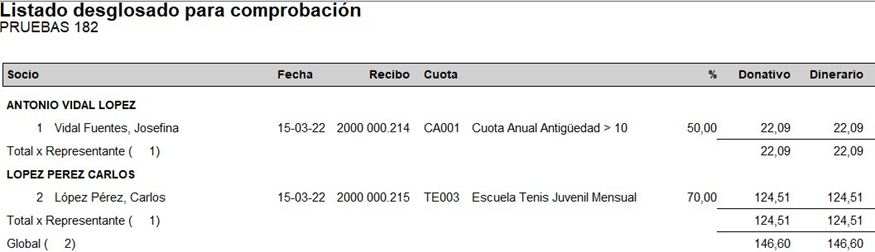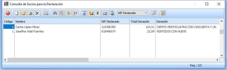 Sin embargo la relación de socios para la declaración del modelo 182 solo muestra a 2 personas, ya que los bonos o las inscripciones no han sido contempladas. Además el importe de donación es el cálculo del porcentaje indicado.