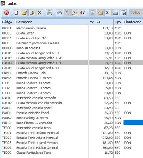• En el ejemplo he etiquetado mis tarifas usando el campo “Tipo” para separar Cuotas, Escuelas y Bonos.